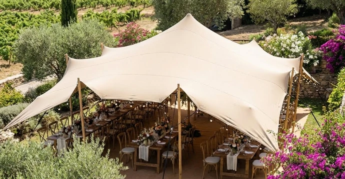 Tentes nomades stretch au design unique. Structure élégante et confortable qui crée une ambiance authentique pour votre mariage.